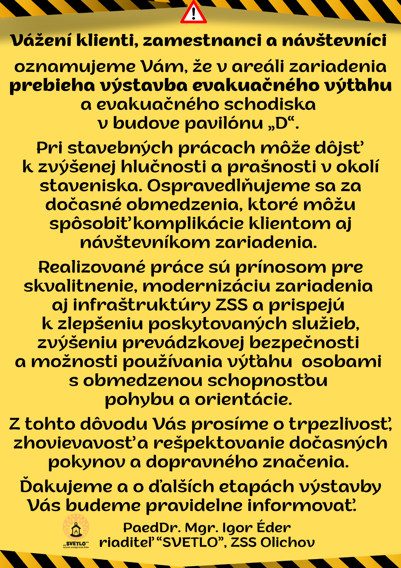Oznam o stavebných prácach a obmedzeniach v pavilóne "D"